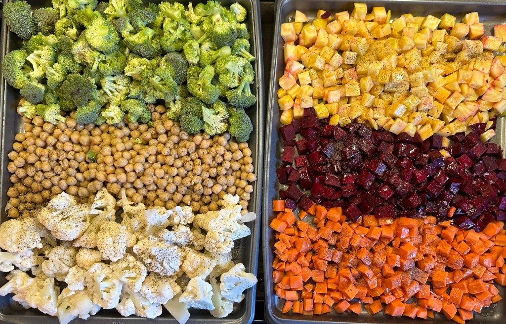 2. Prepare the vegetables: Toss the broccoli, cauliflower, chickpeas, beets, and sweet potato with olive oil, salt, and pepper. Spread them evenly on a baking sheet.