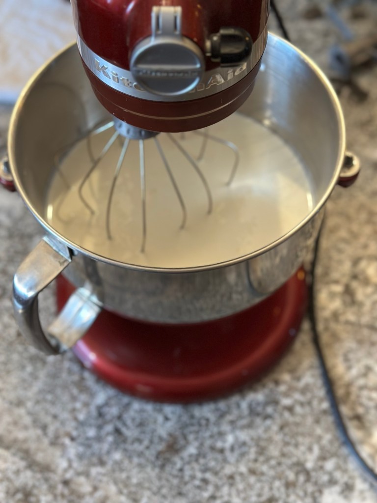 Add the heavy cream to your KitchenAid mixing bowl. Using the whisk attachment, start mixing on medium-high speed.