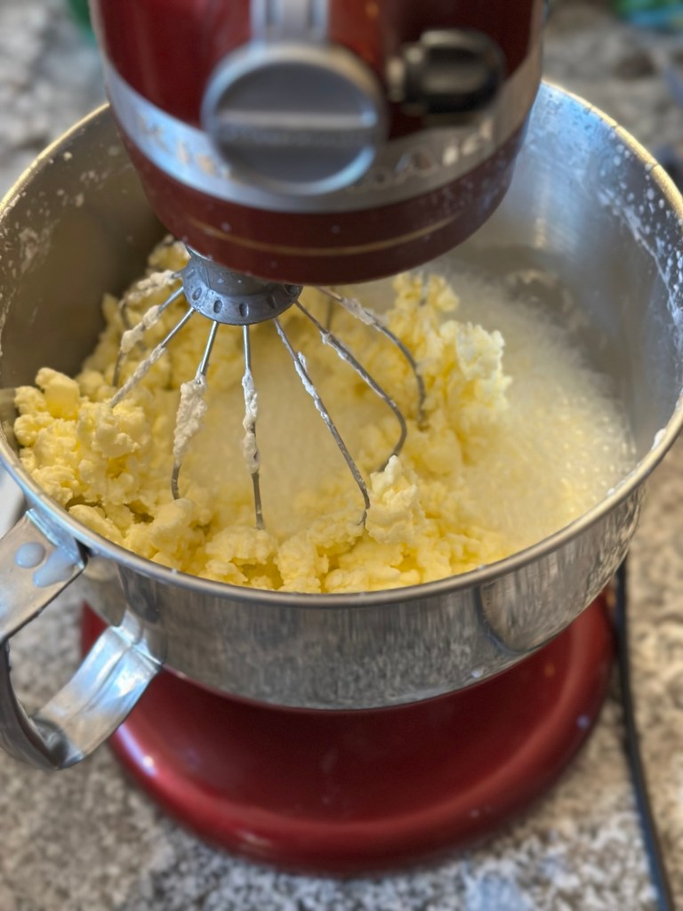 First, you’ll get whipped cream. Keep going! After a few more minutes, the cream will start to separate into butter and buttermilk. This is when the magic happens—it’ll look clumpy and watery, and you’ll hear a sloshing sound.